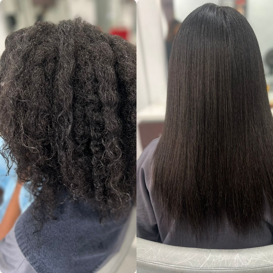 A Keratin Treatment, or Brazilian hair straightening, is a long term yet temporary solution to reduce curl pattern or frizz. A keratin treatment is different than a chemical straightening treatment, which will permanently straighten the hair. Keratin treatments are a great way to manage new growth if you've had a chemical relaxer or thermal straightening treatment.